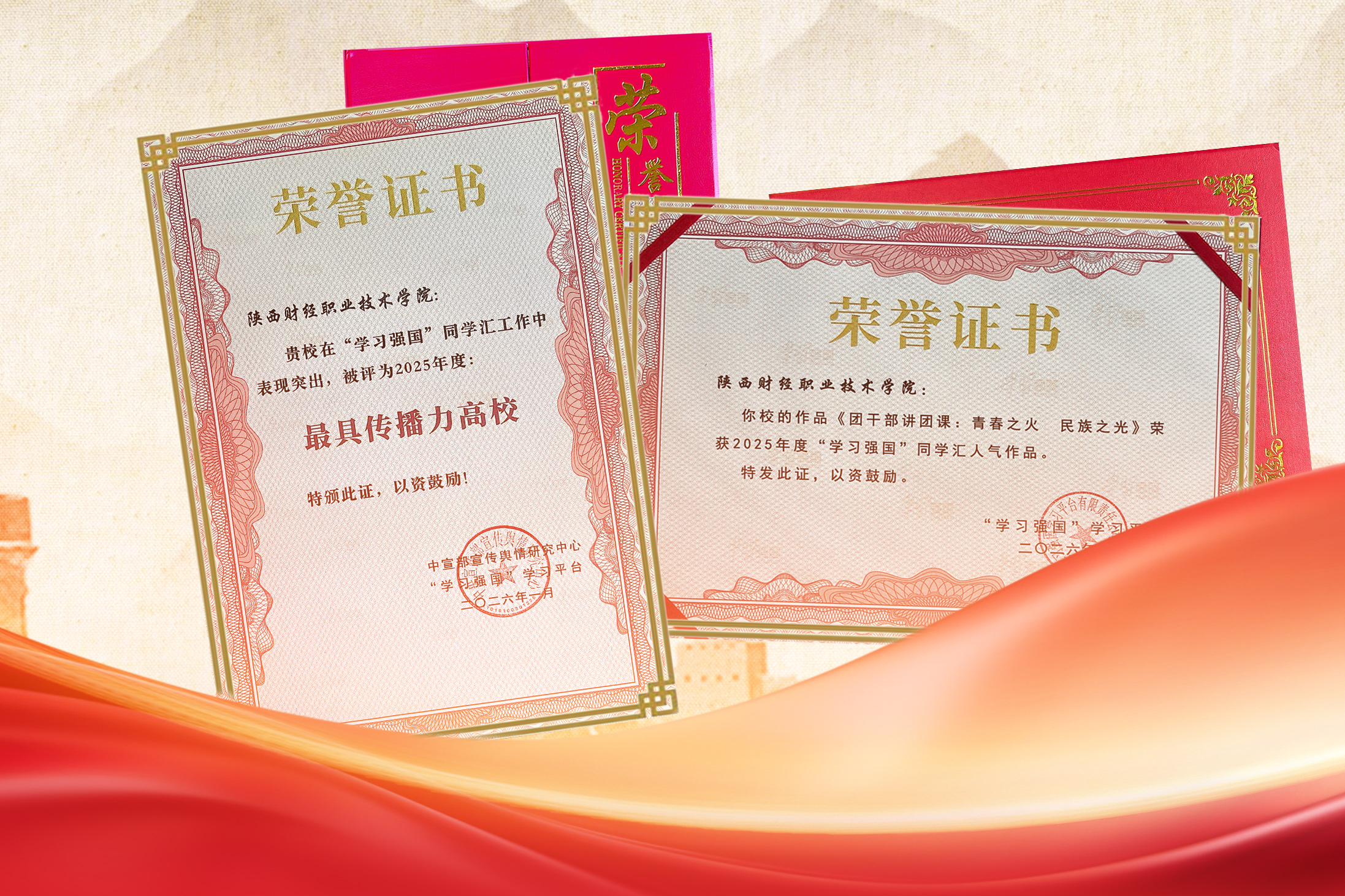 近日,中宣部宣传舆情研究中心、“学习强国”学习平台公布2025年度同学汇评选结果,我校凭借扎实的平台运营与优质的内容创作,获评2025年度“最具传播力高校”。学校选送作品《团干部讲团课:青春之火 民族之光》从全国近7万件作品中脱颖而出,获评2025年度“学习强国”同学汇人气作品,我校在该平台的运营成效再次获得国家级认可。